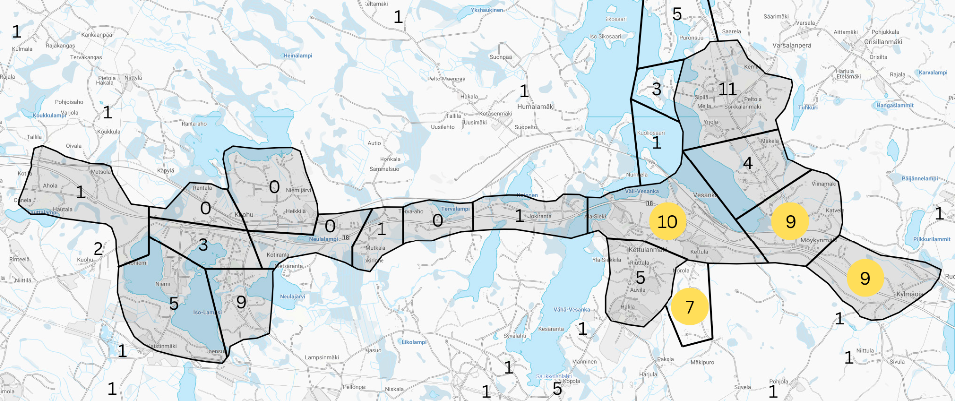 Hankealueen kartasta näet tilaukset alueittain. Voit suurentaa karttakuvaa klikkaamalla sitä (päivitetty 19.3.2026). Olemme valmistelemassa tukihakemusta keltaisella merkityille alueille. Otamme hakemukseen mukaan myös muita alueita, mikäli tilaajia saadaan riittävästi.