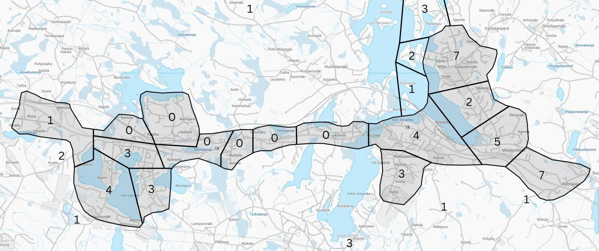 Hankealueen kartasta näet tilaukset alueittain. Voit suurentaa karttakuvaa klikkaamalla sitä (päivitetty 26.11.2025)